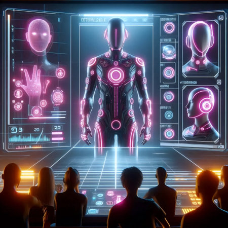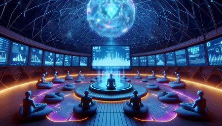 Innovators engage with holographic data and interactive screens in a cutting-edge research facility