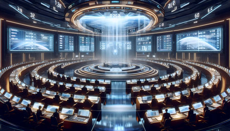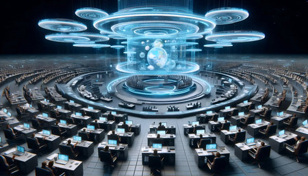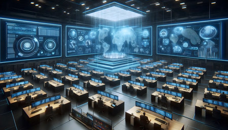 A futuristic office space with a large room featuring a central platform and numerous workstations with glowing blue lights