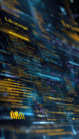 This image features an abstract representation of digital data, with code lines illuminated in yellow and blue hues. The composition showcases a technological aesthetic, with a blurred background. The imagery is suitable for various commercial uses related to technology, software, and data visualization.