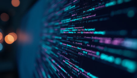 Glowing digital code on a dark background.