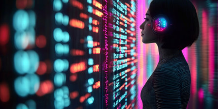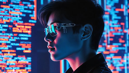 A person is shown in front of multiple screens displaying code and graphical representations. The scene exhibits a cool color palette with predominantly blue hues, suggesting a tech-focused environment. This image could be used in editorial contexts, such as articles discussing technological innovation or digital interface design.