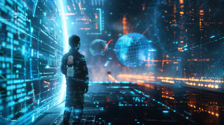 A man engaged in online surfing amidst a futuristic digital landscape of advanced technologies