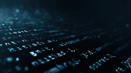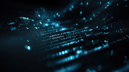Experience a captivating abstract digital background featuring glowing code text and flowing particles, symbolizing the essence of technology and data innovation.