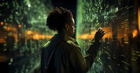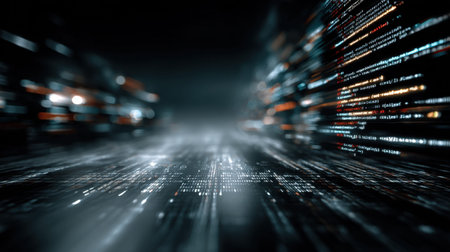 Dive into the world of technology with this abstract image featuring a digital matrix filled with luminous numbers and codes, representing data processing and innovation.