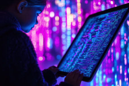 A child engages with a luminous screen displaying colorful coding, immersed in an innovative environment.