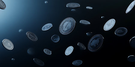 A lot of cryptocurrency coins lie on a dark surface background