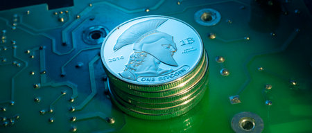 Digital currency physical silver bitcoin coin with blurred bokeh background.