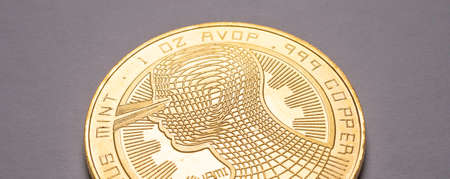 Close up shot of a golden Qtum digital cryptocurrency.