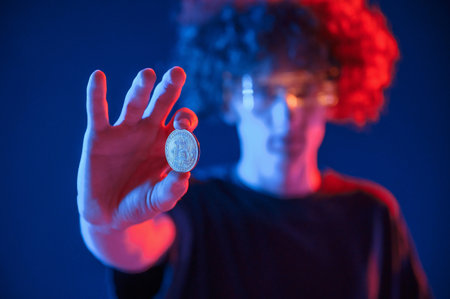 Holding bitcoin. Young man with curly hair is indoors illuminated by neon lighting.