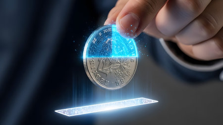 Hand holds a coin that is half Bitcoin and half an old coin in a digital slot. Clear details and ...