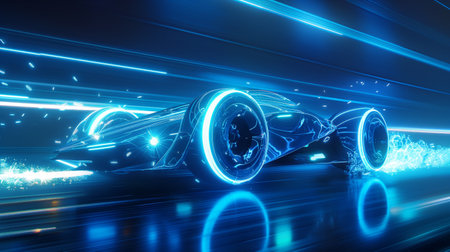 A sleek, futuristic car with glowing neon blue lights speeds through a dark, high-tech environment.