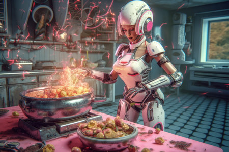 The AI chef is preparing a delicious meal. He is using fresh ingredients and state-of-the-art technology to create a truly unique culinary experience.