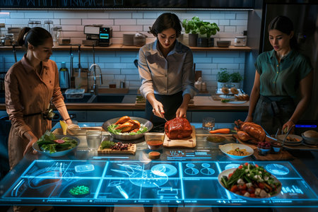 Experience a blend of culinary art and high-tech presentation with vibrant dishes set in a sleek modern kitchen, illuminated by futuristic lighting and digital elements.