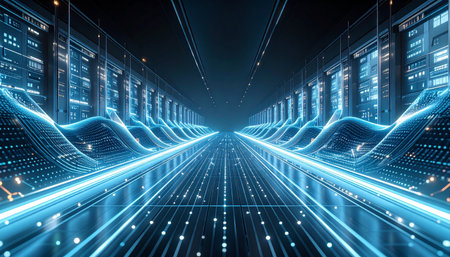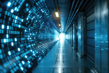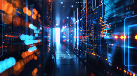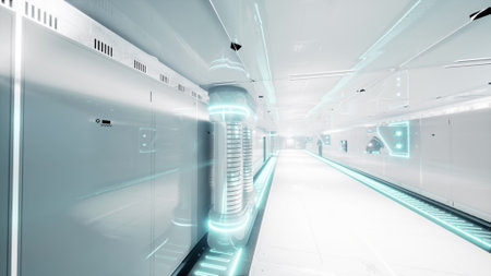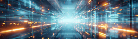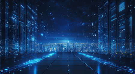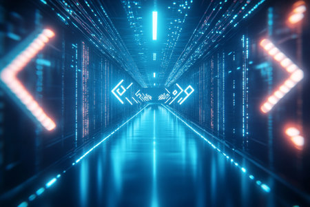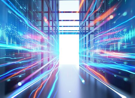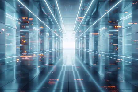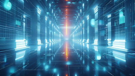3d rendering of futuristic server room with blue light glowing in the dark