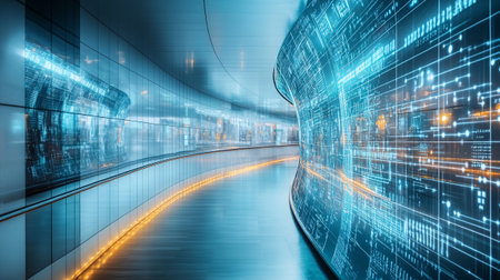 Empty futuristic corridor with glowing digital displays and reflections on the floor