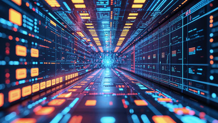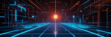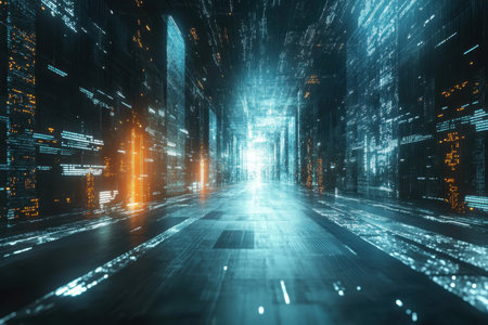 A vibrant corridor illuminated by blue and orange lights reflects a digital cityscape at night.