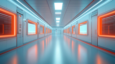 Futuristic cyberpunk corridor with glowing neon lights and reflective floor in blue and orange hues