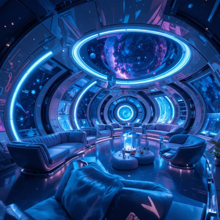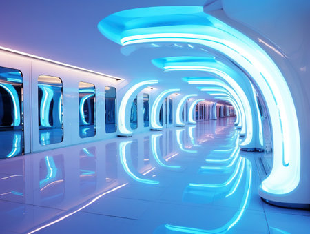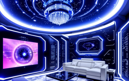 A captivating view of a futuristic interior showcasing sleek LED lights and a high-tech panel, creating a vibrant atmosphere suitable for modern spaces.