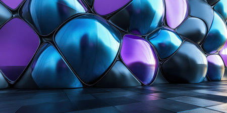 An artistic digital rendering presents geometric structures with mirrored surfaces. These crystalline forms are arranged on a grid, illuminated with cool blue light, and positioned within a virtual environment. The design emphasizes reflections and patterns, suitable for digital art or technology-related uses.