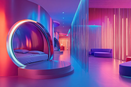 Explore a high-tech hotel featuring glowing blue and purple sleeping pods designed for ultimate comfort and relaxation in a vibrant, modern ambiance.