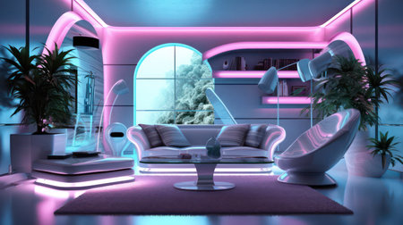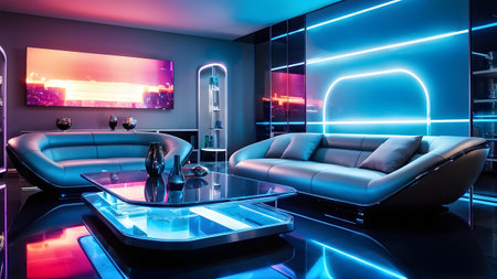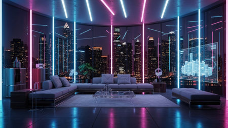 This interior design showcases a contemporary living space featuring vibrant neon lights and a cityscape visible through large windows. The scene includes modern furniture, and a sophisticated color scheme. Suitable for various applications, including design projects and advertising, this image captures a stylish ambiance.