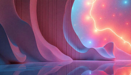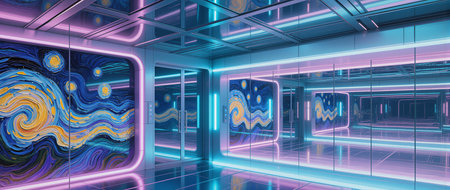 An immersive room showcases vivid artwork with glowing neon accents, creating energy.