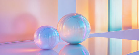 Shiny glass spheres with colorful reflections on a glossy surface