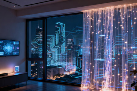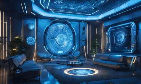 high quality illustration, modern home interior design featuring metallic furniture and interactive holographic display panels, embodying futuristic living