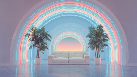 Brightly lit interior space featuring a white couch in a modern style. Pastel colors and neon lighting are prominent features of the room. A potted palm tree adds a tropical feel.
