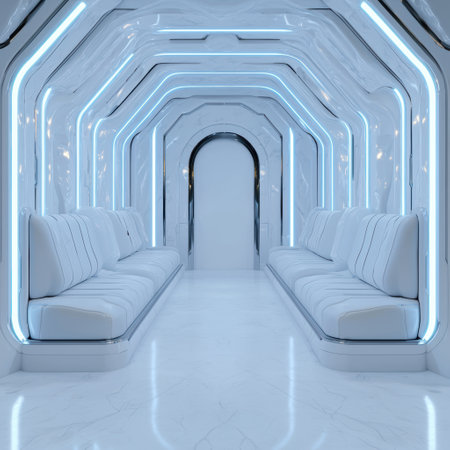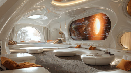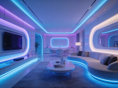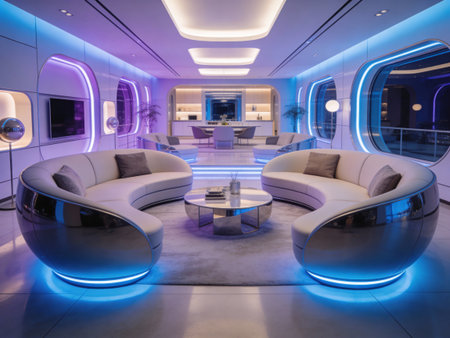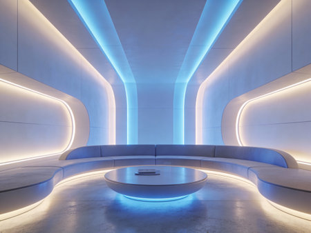 Futuristic interior design with sleek white furniture and glowing lights