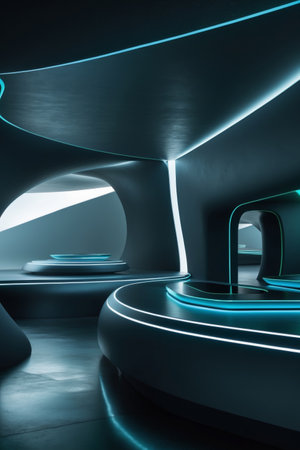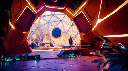 A stunning futuristic interior with neon lights and unique design elements.