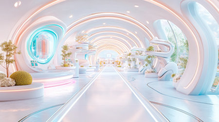 Futuristic interior design showcasing a vibrant corridor with innovative architecture and lush greenery during daylight