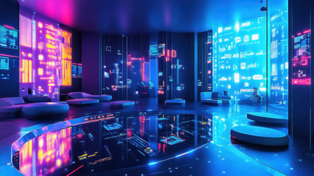Explore a futuristic digital space filled with vibrant neon lights and holographic displays, perfect for projects related to technology and innovation.