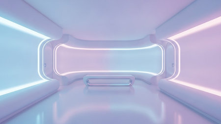 A minimalist futuristic interior space with smooth white walls illuminated by soft glowing neon strips in blue and...