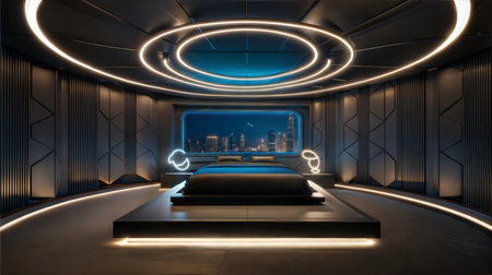 Futuristic dark room with a big bed and glowing lights 3D rendering