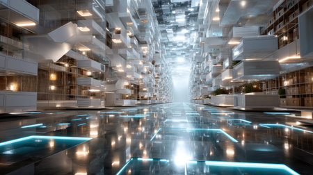 Explore a captivating futuristic interior featuring sleek lines, glossy floors, and a play of bright lights reflecting in an abstract space.