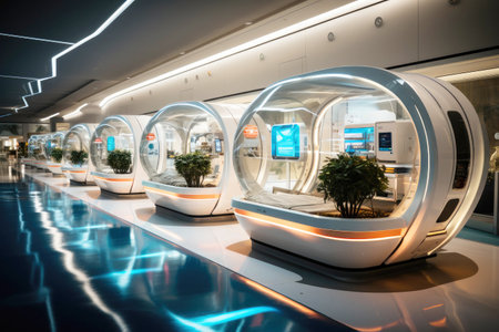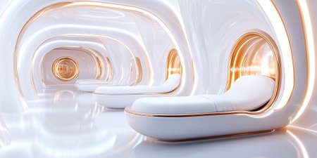Futuristic interior showcasing modern white loungers with circular windows. Bright and airy setting with soft ambient lighting. Concept of wellness, relaxation, spa design.