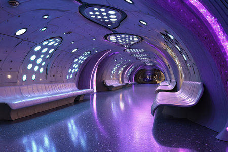 This futuristic underground station features glowing circular lights and stylish, curved seating for commuters.