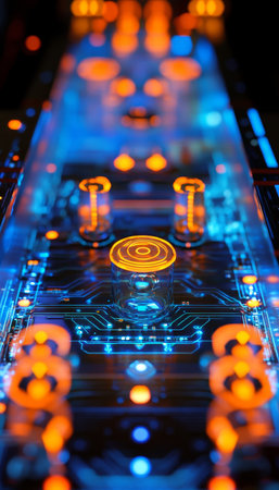 Futuristic circuit board close up showcasing vibrant blue and orange elements in digital design