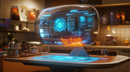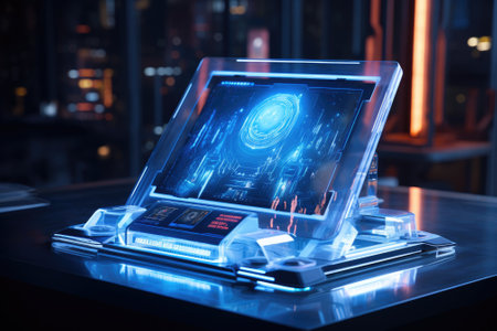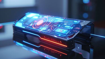 A sleek, modern high-tech device with a holographic interface, showcasing advanced technology and innovation