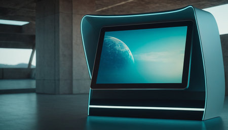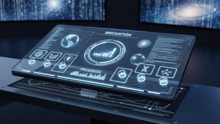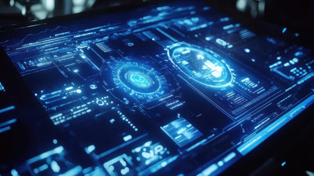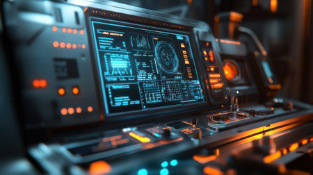 This image features a sleek and modern control panel with an advanced display interface. The design combines futuristic elements, interactive graphics, and a sophisticated user experience, ideal for technology and science fiction themes.