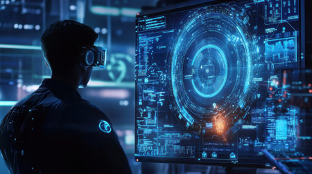 Software engineer wearing vr headset working with holographic interface in futuristic monitoring room