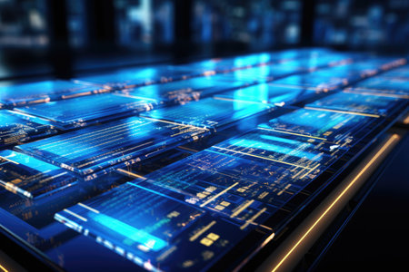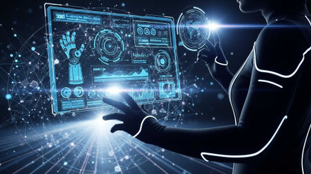 Futuristic digital interface featuring glowing blue lights and abstract technological background