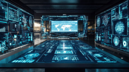 A modern futuristic data control center featuring advanced digital screens and holographic displays. Ideal for technology and innovation themes.
