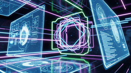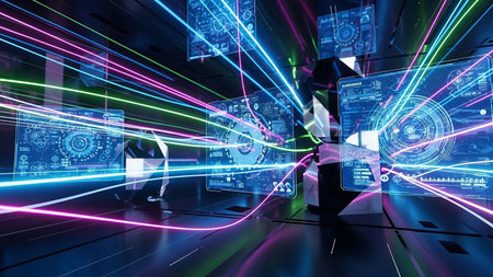 This image showcases a high-tech digital interface featuring vibrant neon visuals and intricate data representations, ideal for technology and innovation themes.