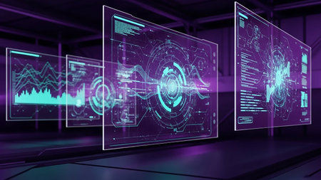 Multiple transparent holographic screens display complex data visualizations and futuristic interfaces in a dark, modern setting with vibrant purple and teal lighting.