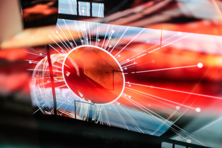 This image showcases a futuristic digital interface featuring vibrant neon accents and data visualization elements. It embodies modern technology in an urban setting.