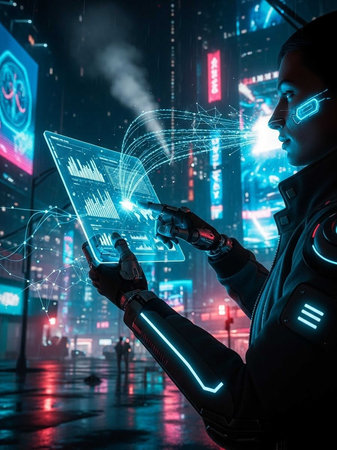 Cyborg using holographic tablet in neon-lit city