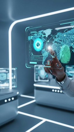 Hand touching holographic fingerprint on digital map