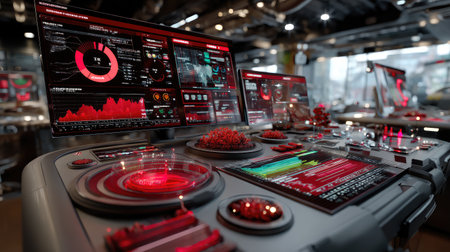 A modern control room featuring an array of sophisticated data displays and analytics tools, designed with a striking red theme and high-tech features.